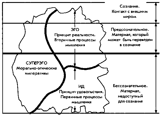 Термин «психоанализ» имеет три значения: 1) теория личности и психопатологии, 2) метод терапии личностных расстройств и 3) метод изучения неосознанных мыслей и чувств индивидуума. Это соединение теории с терапией и с оценкой личности пронизывает все аспекты представлений Фрейда о человеческом поведении. Однако под всеми этими хитросплетениями и сложностями лежит относительно небольшое число исходных концепций и принципов, в которых отражается психоаналитический подход Фрейда к личности. Рассмотрим сначала его взгляды на организацию психики, которую часто называют «топографической моделью» Фрейда.